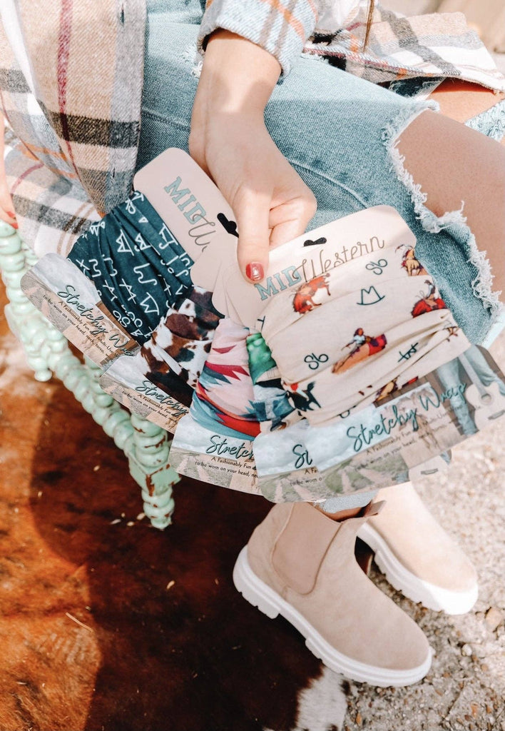 These stretchy wraps have a vintage cowboy pattern, and multiple uses like ponytail holders, headbands, wear as gaiters or handkerchiefs around neck, ankle bracelets and so many more! You'll love how they are lightweight, soft and extremely stretchy while holding in place. Stock up on all of our patterns so you don't find yourself somewhere without one!