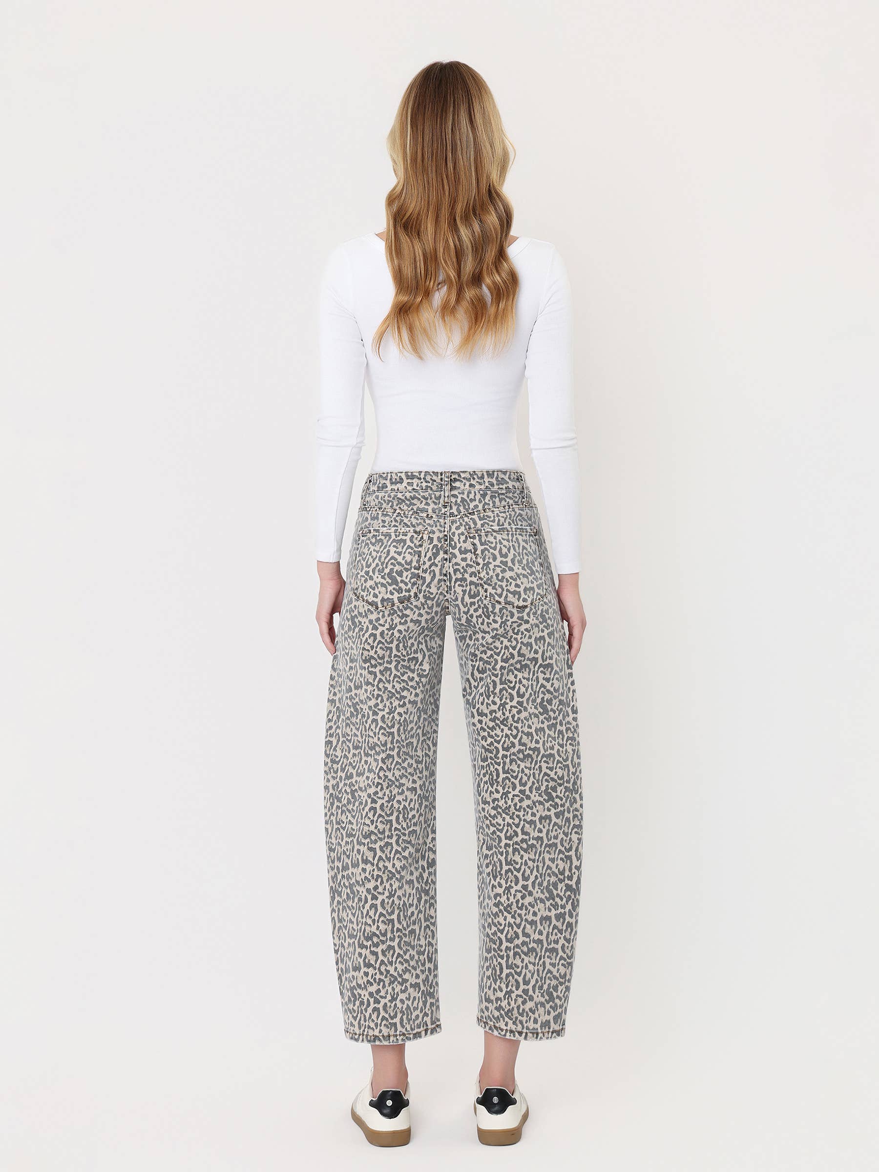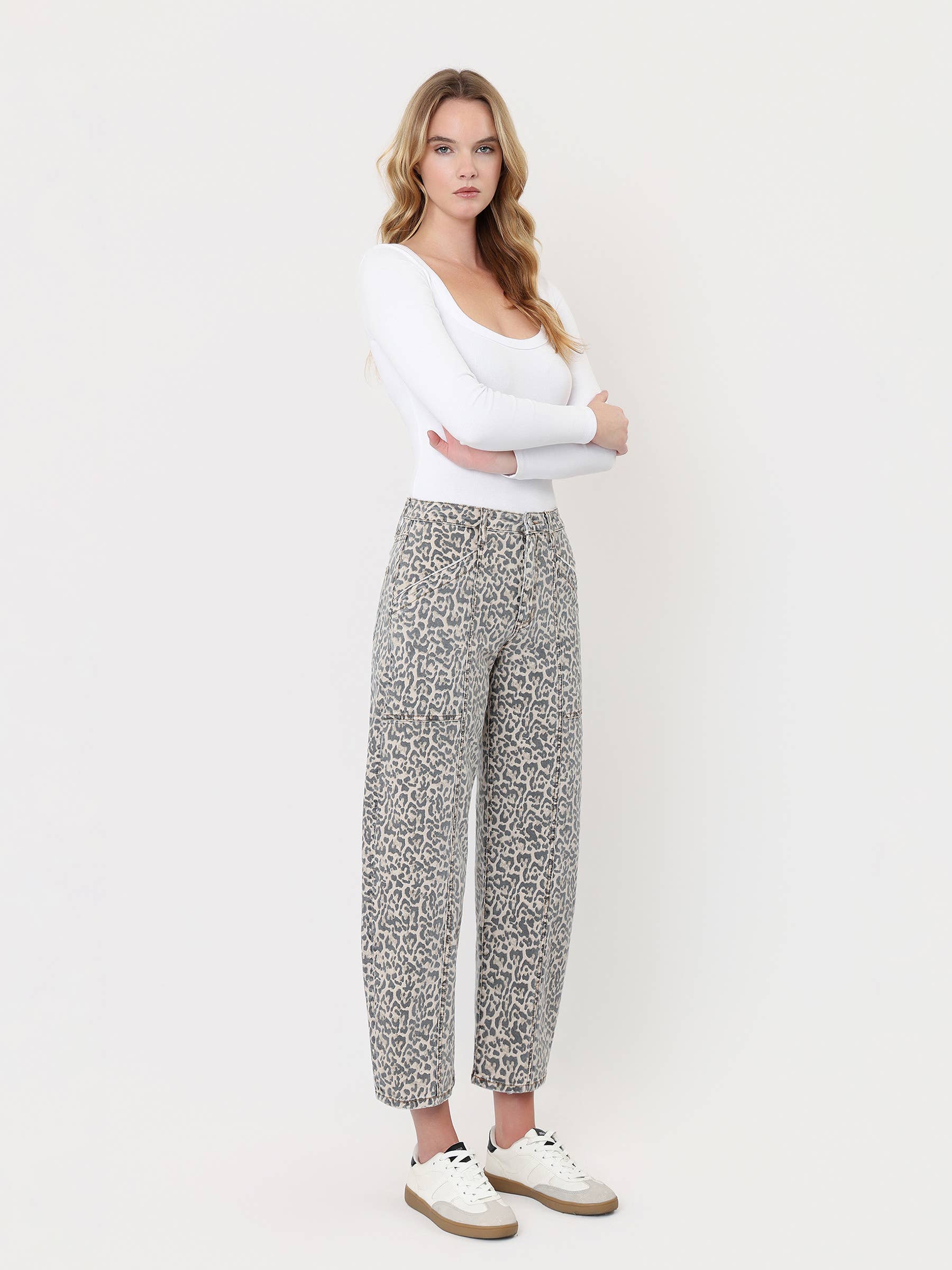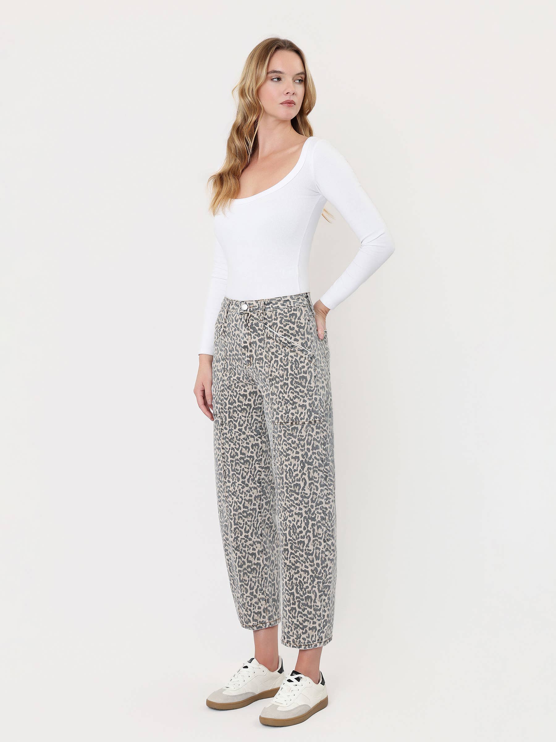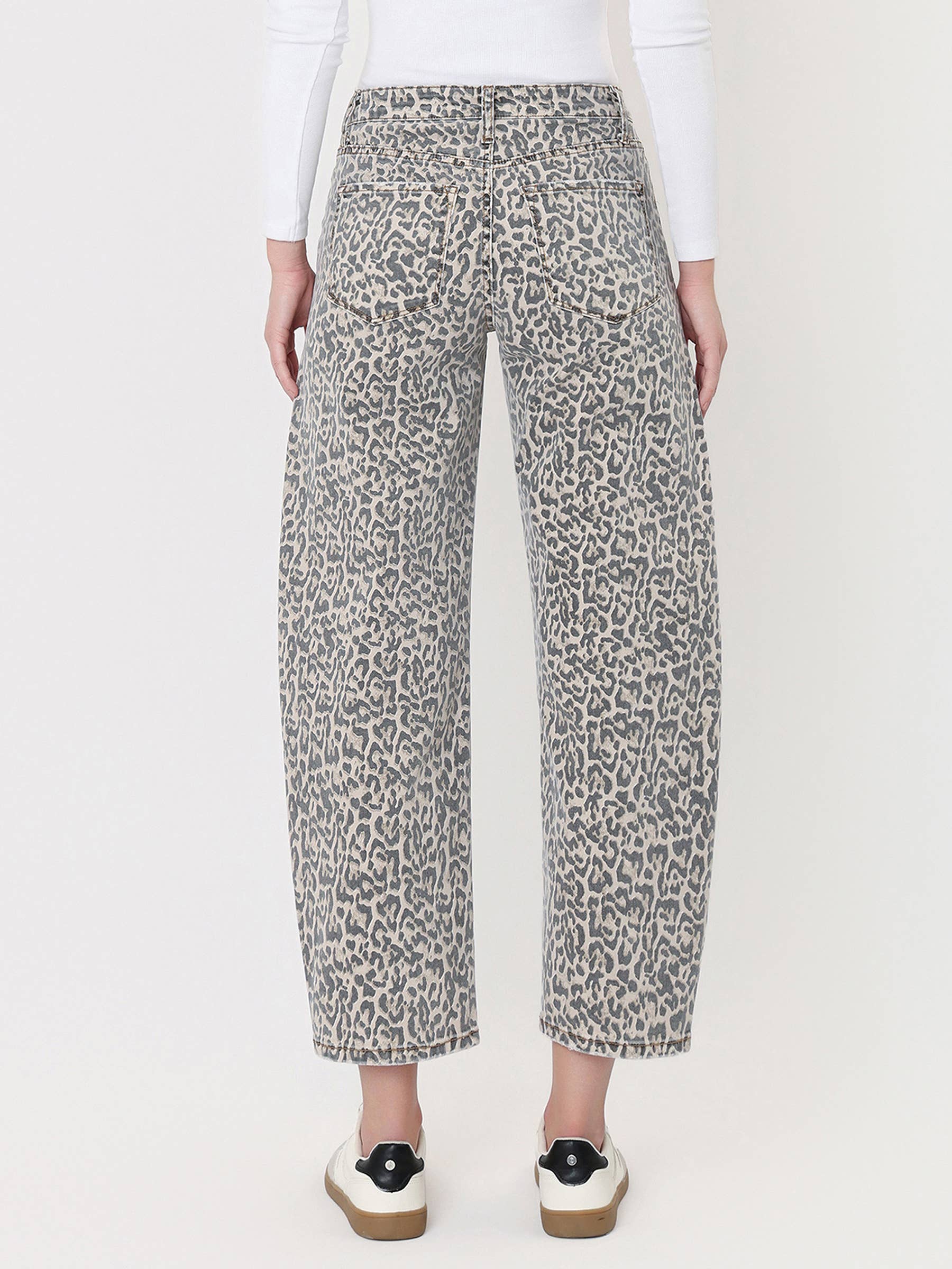 HIGH RISE LEOPARD PRINT UTILITY BARREL JEANS