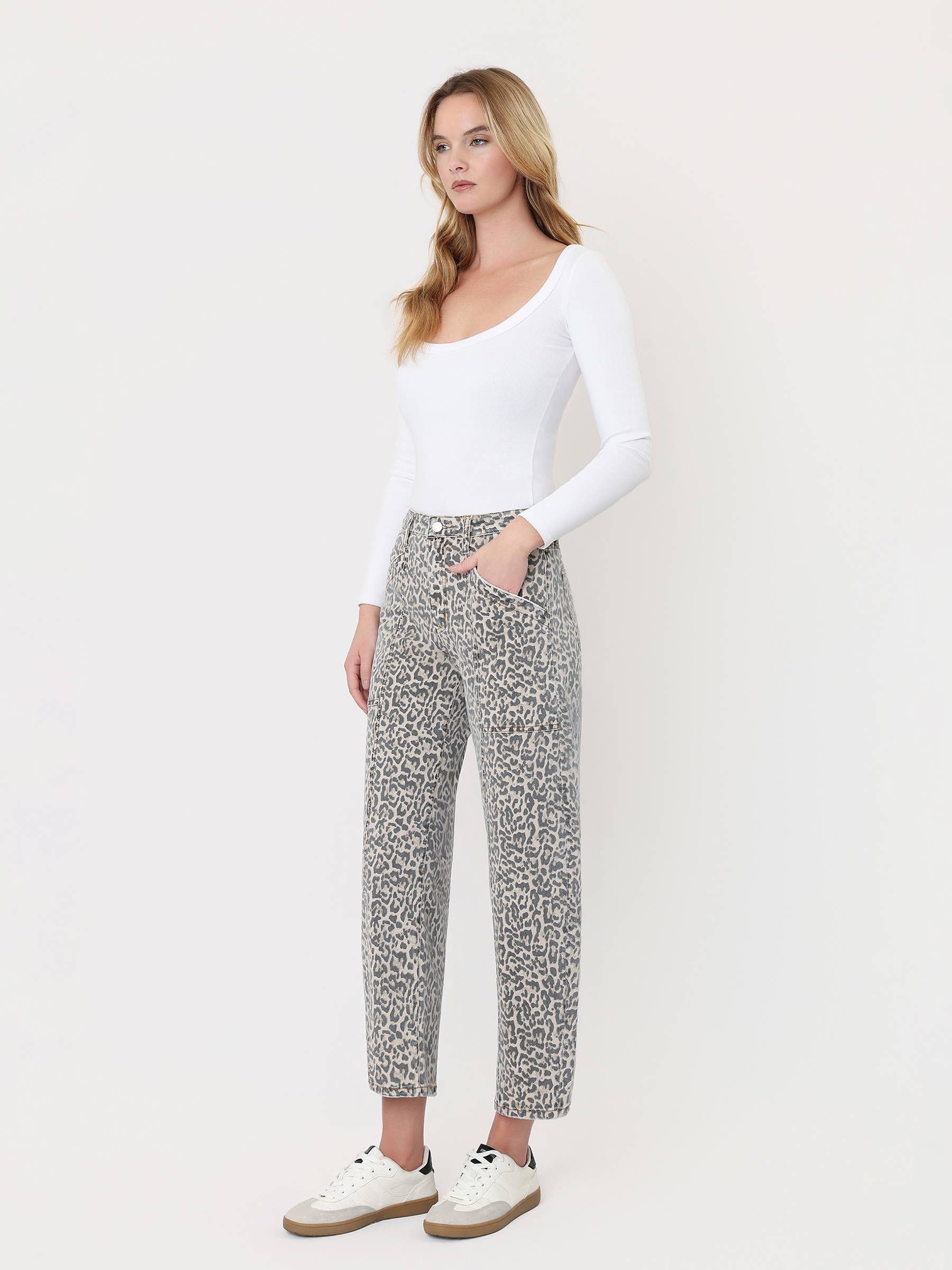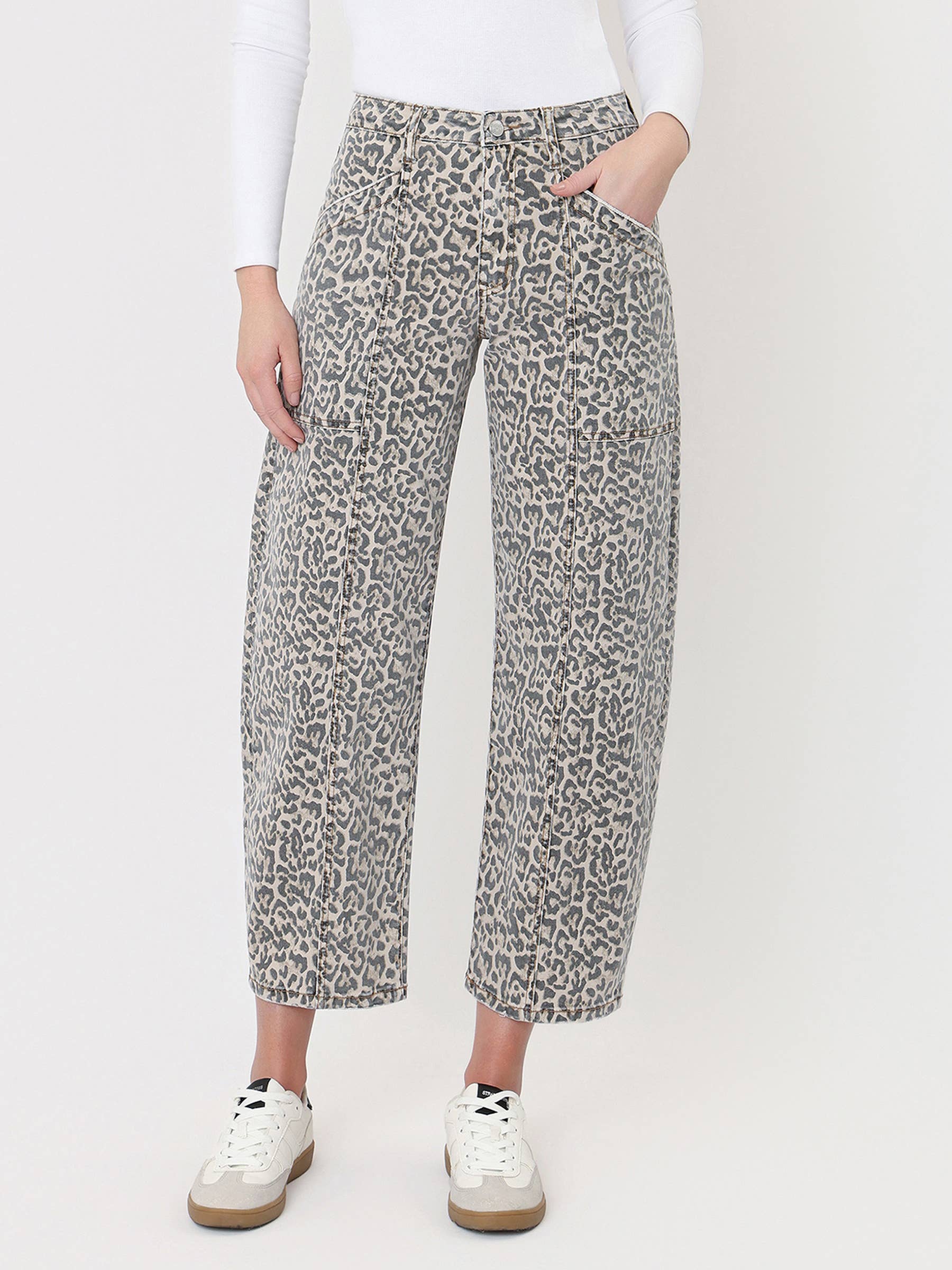 COMFORT STRETCH DENIM, HIGH RISE WAIST, UTILITY POCKETS, SEAM DETAIL, FINISHED HEM, CROPPED LENGTH, LEOPARD PRINT, BARREL JEANS