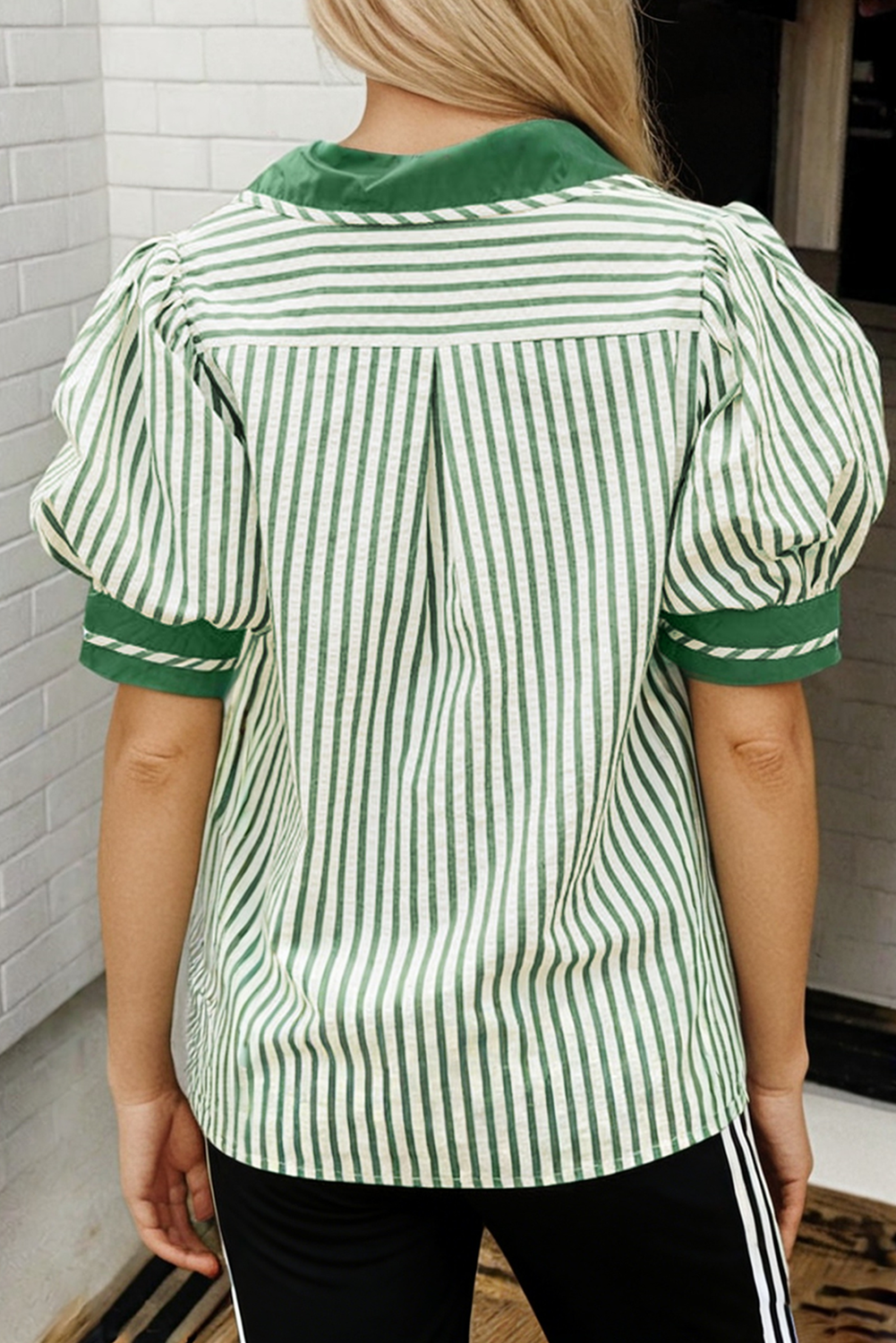 Stripe Split Neck Short Bubble Sleeve Blouse